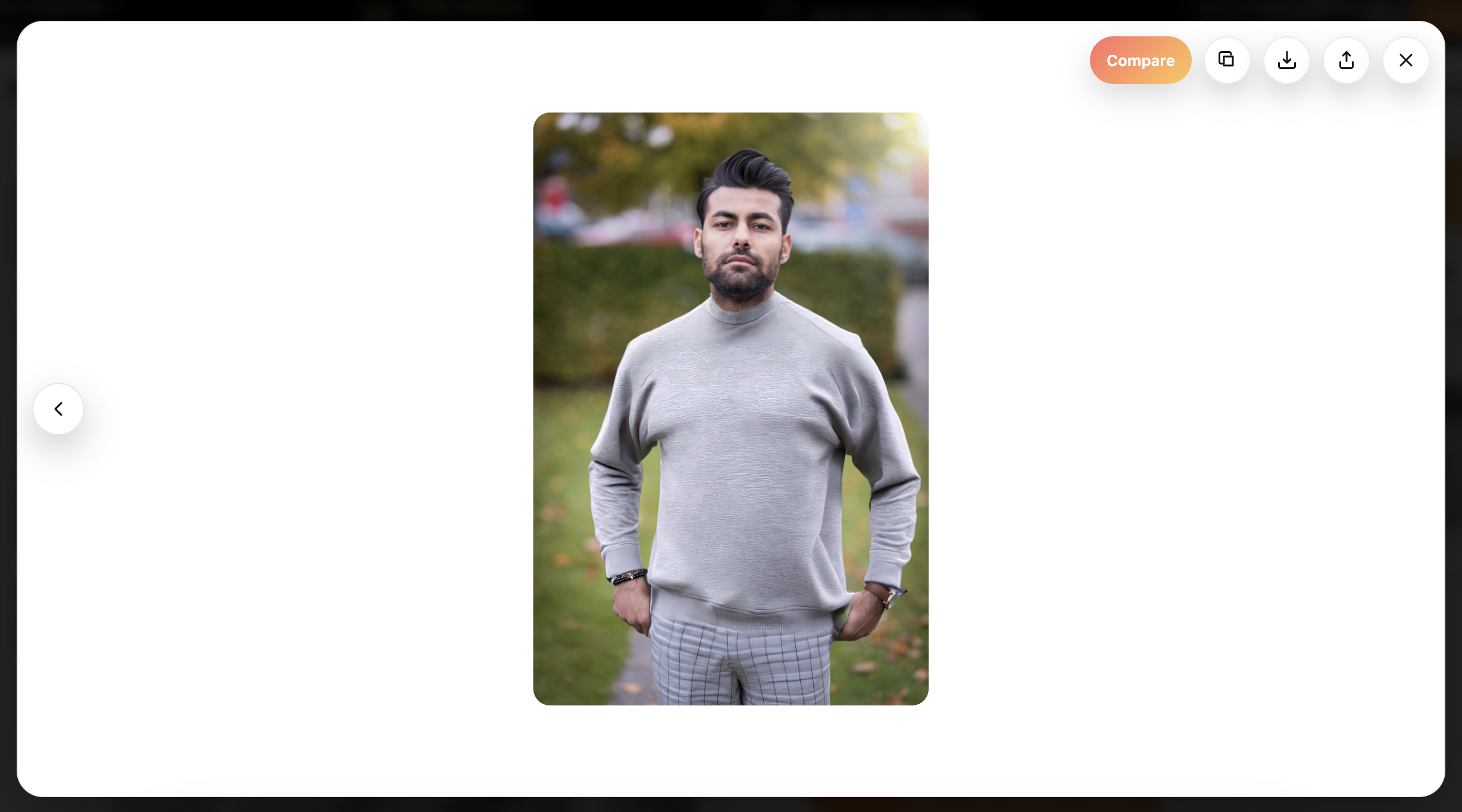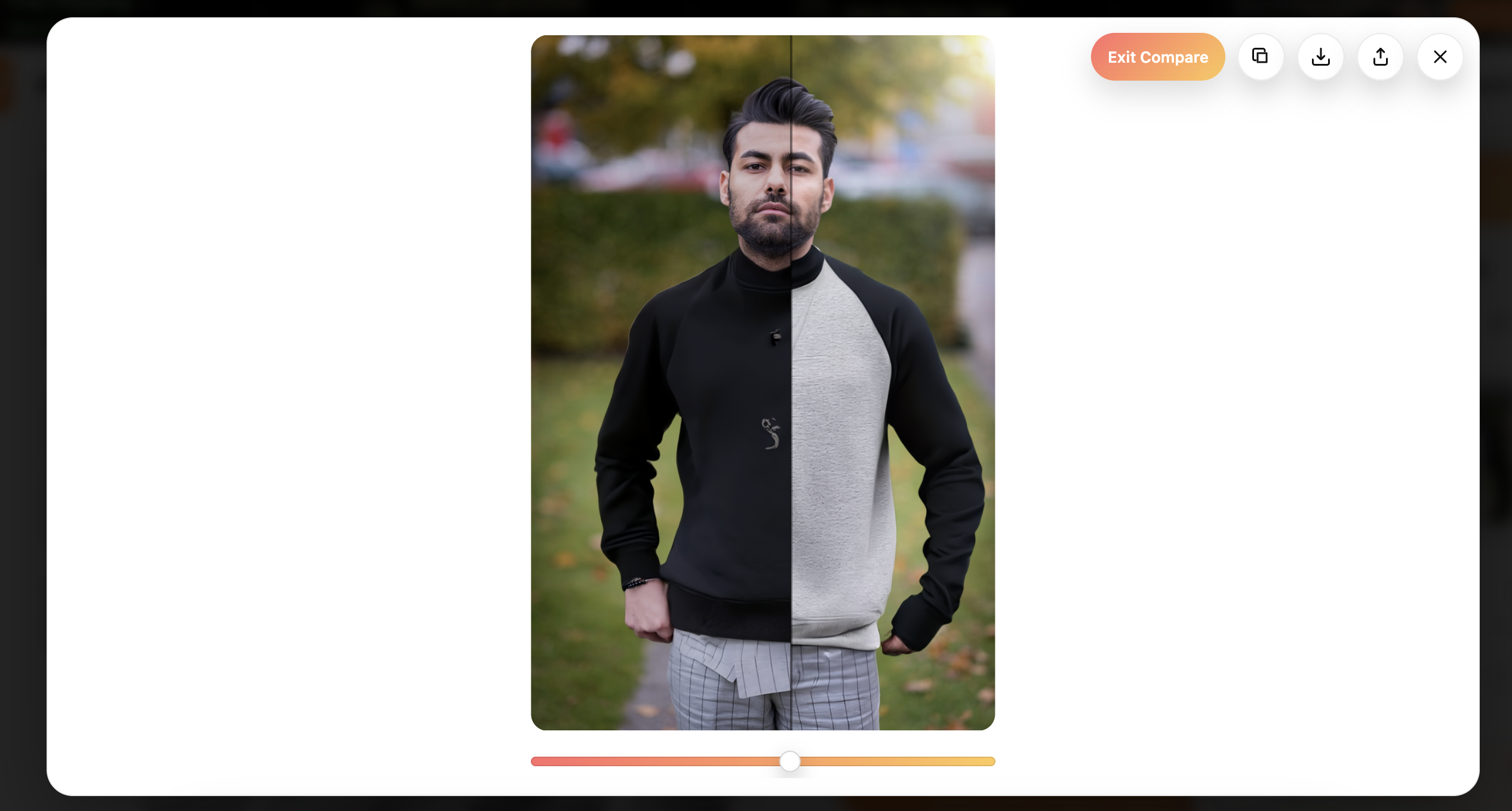 Once generated, you can view the try-on full screen, compare with the original via slider, download, share, and browse your history.