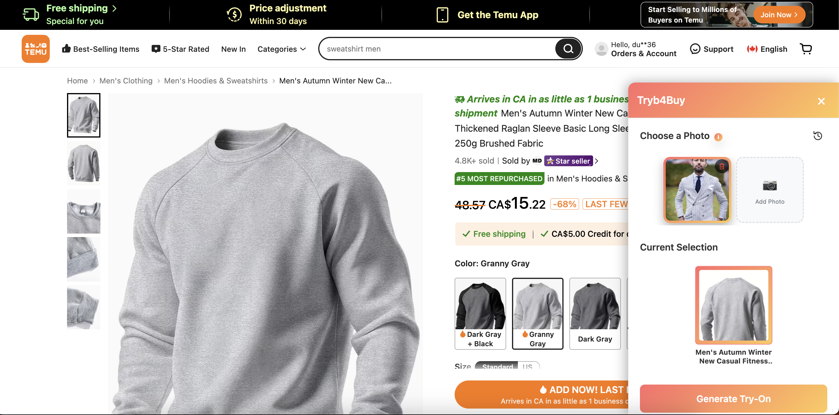 Visit a product page on Amazon, Temu, or Lululemon. Works with: